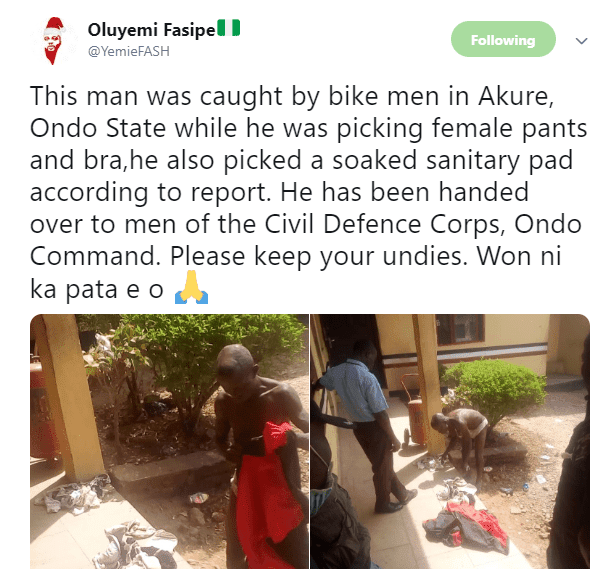 ”This man was caught by bike men in Akure, Ondo State while he was picking female pants and bra,he also picked a soaked sanitary pad according to report. He has been handed over to men of the Civil Defence Corps, Ondo Command. Please keep your undies.