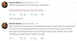 “Now, should we treat women as independent agents, responsible for themselves? Of course. But being responsible has nothing to do with being raped. Women don’t get raped because they were drinking or took drugs. Women do not get raped because they weren’t careful enough.