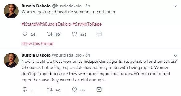 “Now, should we treat women as independent agents, responsible for themselves? Of course. But being responsible has nothing to do with being raped. Women don’t get raped because they were drinking or took drugs. Women do not get raped because they weren’t careful enough.